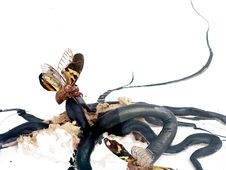 Modelado en Epoxi, MDF, yeso, acrílico y tinta sobre tabique de durlock, insectos realizados con exuvias de cigarras y alas de cigarras y mariposas. 2024